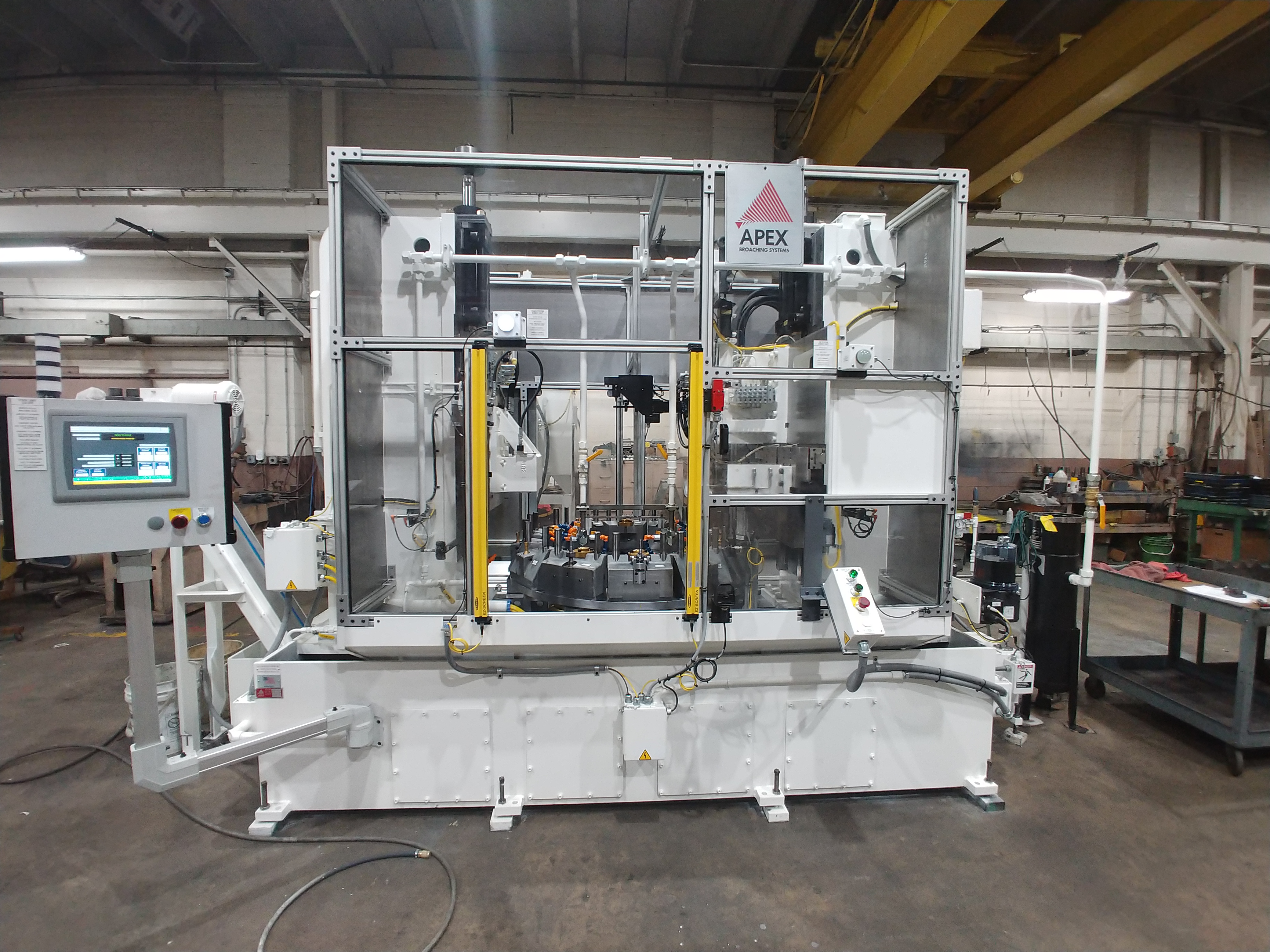 Apex Broaching Systems Blind Hole or Blind Spline broaching machines are built to perform, and are ideal for part applications where the part requires an internal or external spline that ends at a shoulder rather than going through the part. Progressive broach tooling is mounted on a linear or rotating table, a part or pair of parts is automatically loaded onto expanding arbors under a single vertical ram. The parts are pushed into the tooling in quick succession and the table moves for automatic part removal.